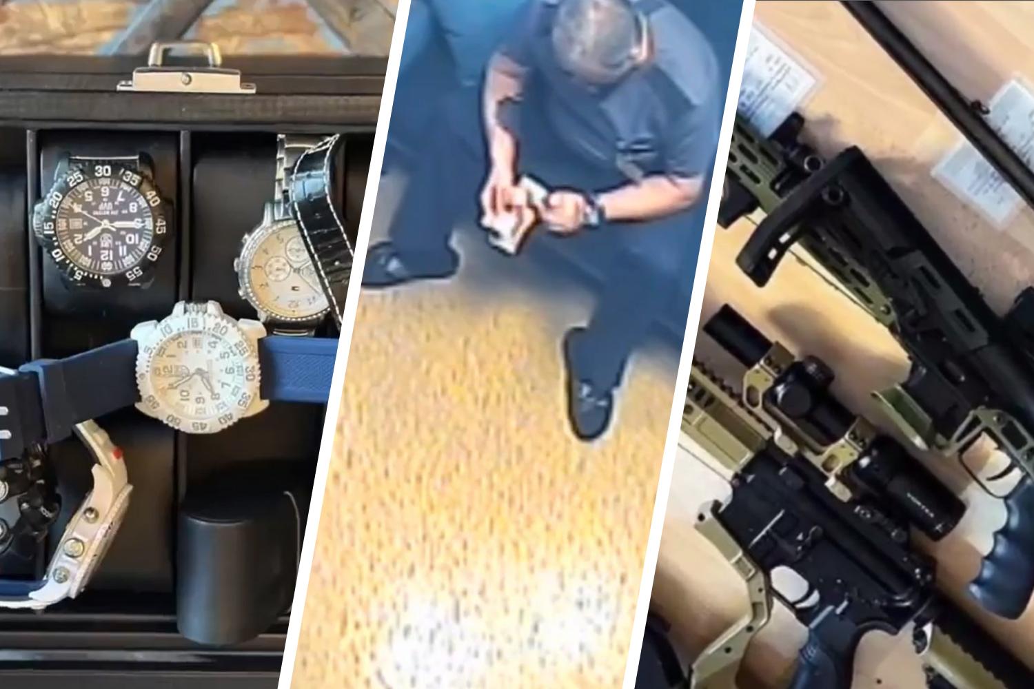 В ходе обысков в квартире Ещина оперативники обнаружили значительные суммы в рублях, евро и долларах, а также коллекции охотничьего оружия, ножей и более восьми элитных наручных часов.