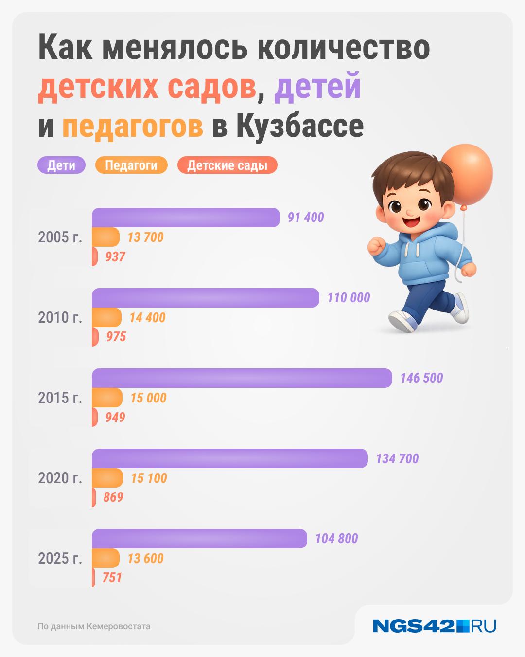 В настоящее время на 100 мест в детских садах Кузбасса в среднем приходится 98 воспитанников. С 2010 года демографическая ситуация в области никогда не была столь низкой. При этом педагогов работает меньше, чем в 2005 году.