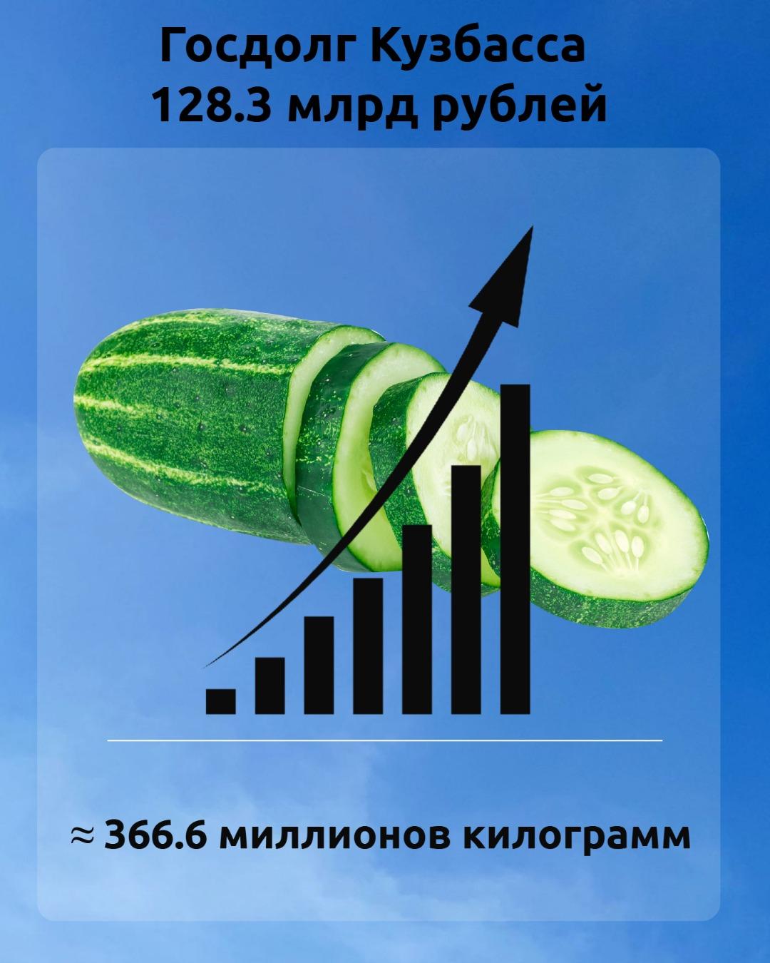 - Государственный долг Кузбасса позволяет приобрести 366,6 млн кг огурцов. Этого количества хватило бы, чтобы раздать по 2,5 кг каждому жителю России.