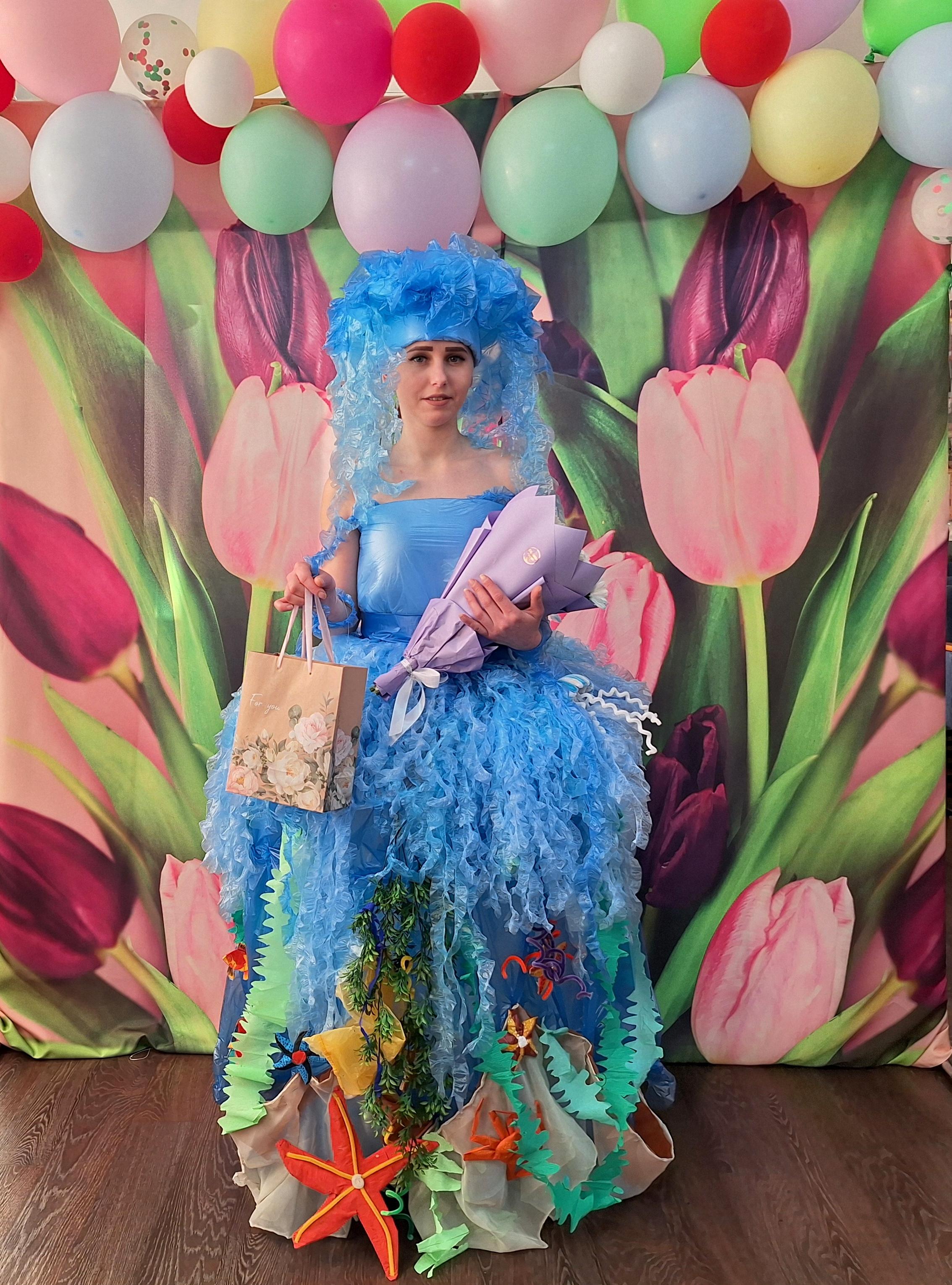 Ее образ под названием «Морская царица» был создан из полиэтиленовых пакетов, канцелярских товаров и швейной фурнитуры.