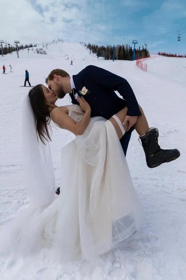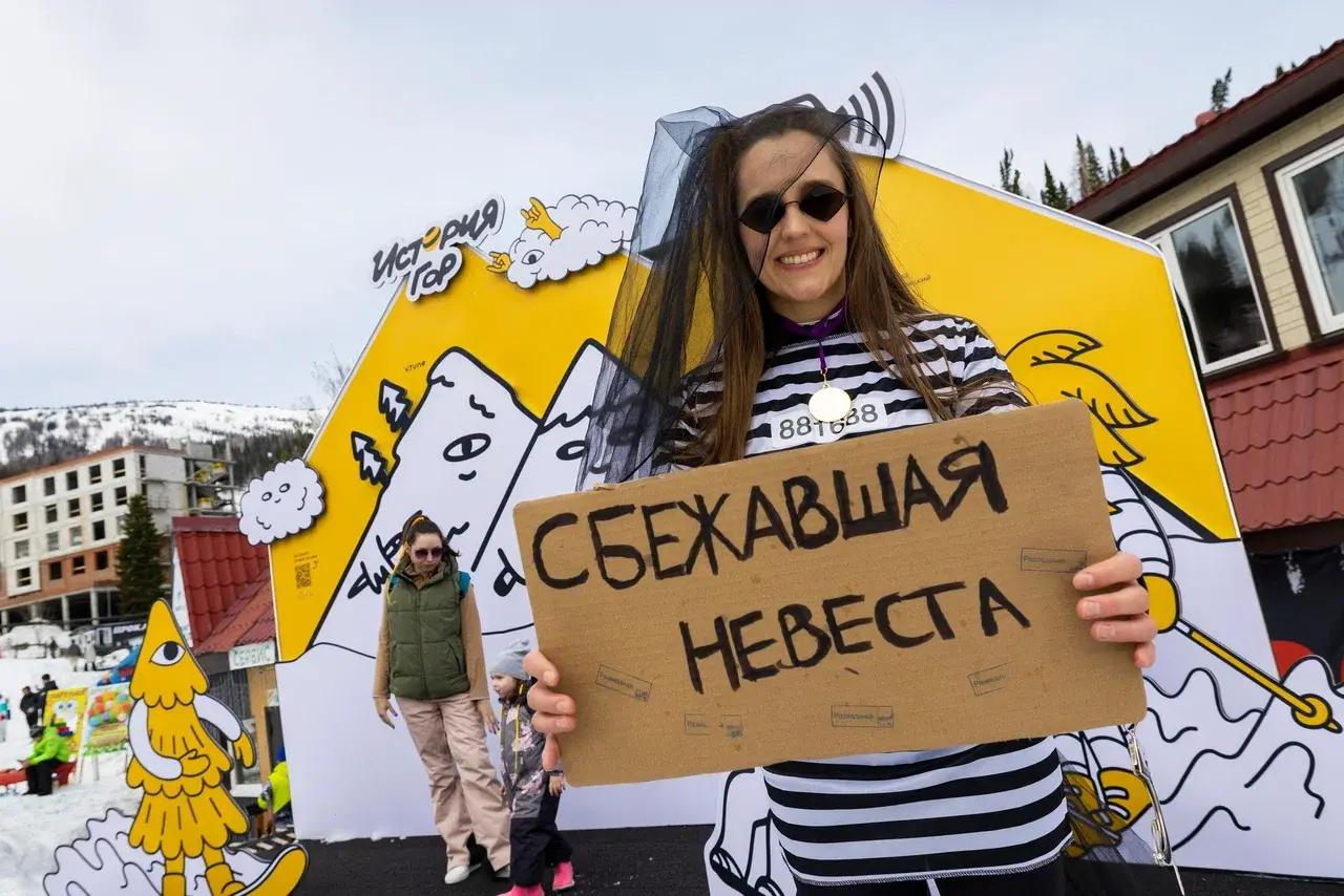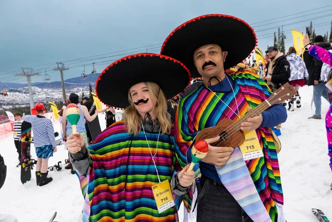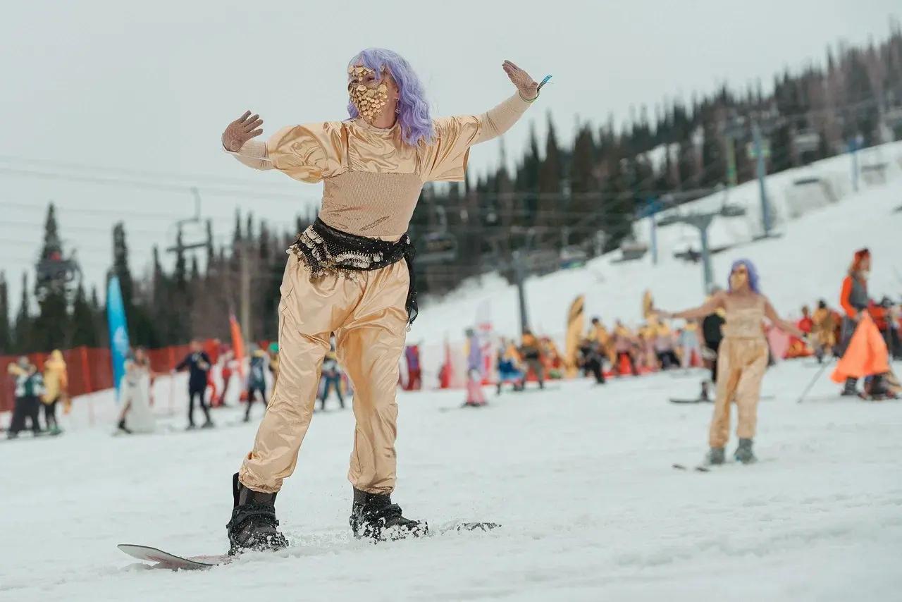 В рамках мероприятия прошел традиционный спуск молодоженов. Невесты в роскошных платьях уверенно держались на сноубордах, а их фаты живописно развевались во время движения.