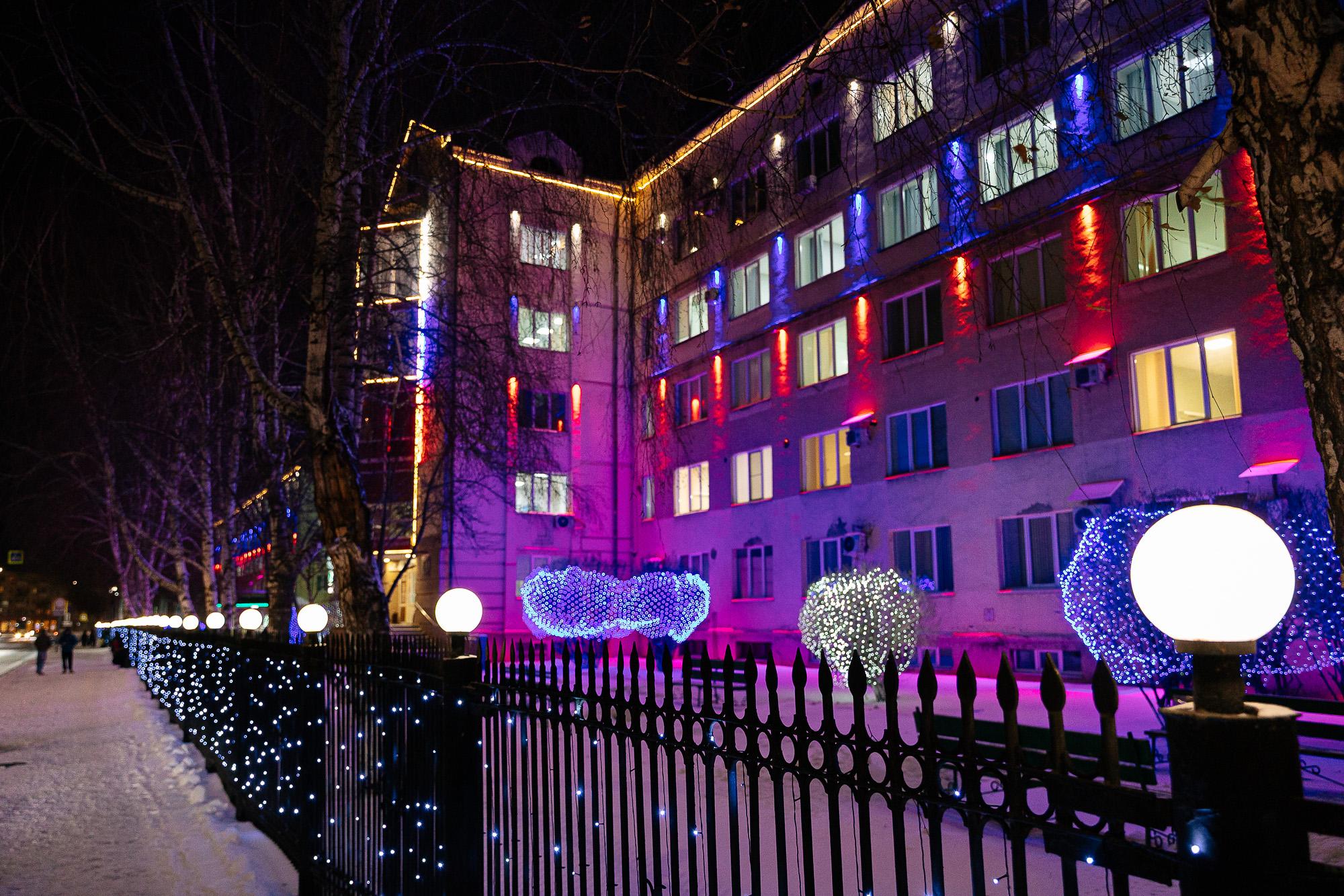 Световые композиции в виде ёлок — главных символов праздника — начали устанавливать на Советском проспекте ещё в ноябре. Сейчас здесь царит праздничное настроение, а сияющие фасады зданий завораживают.