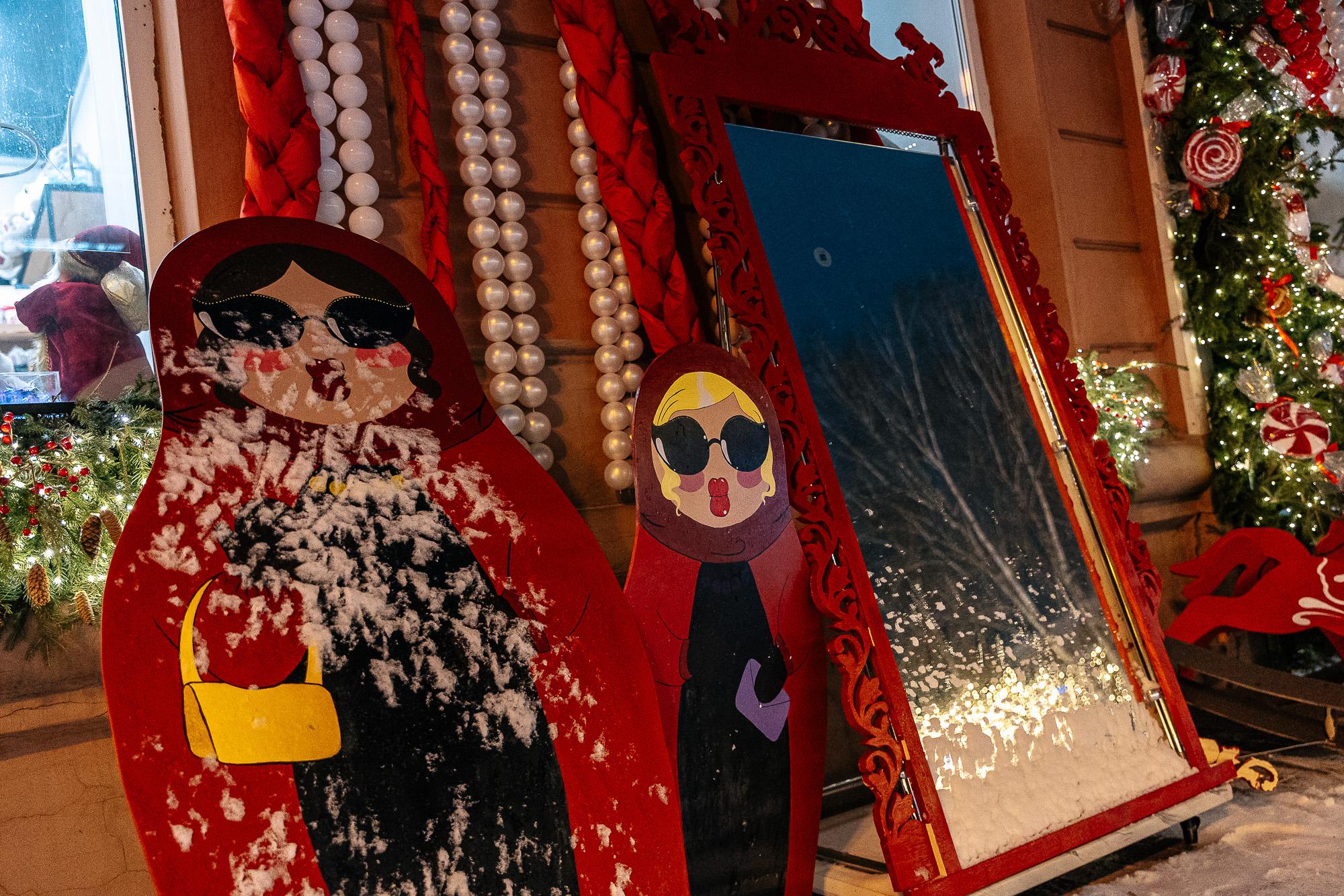За два месяца до праздника витрины магазинов уже засияли гирляндами. Предприниматели проявили фантазию, создав у входа новогодние фотозоны с зеркалами, еловыми ветками, разноцветными шарами и даже матрёшками.