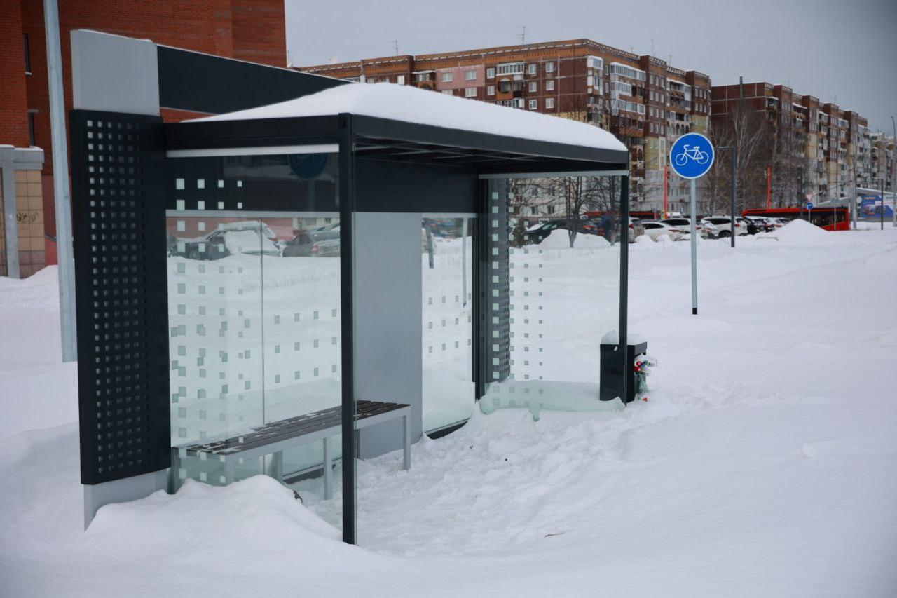 Новый остановочный павильон изготовлен из стекла.