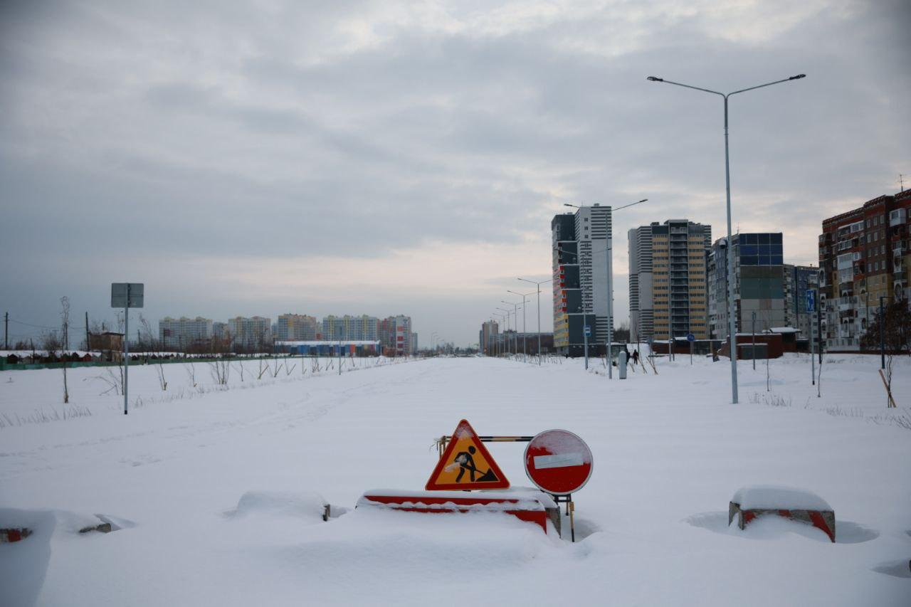 Дорога внешне выглядит почти завершённой, но движение не начато — въезд блокирует знак «кирпич». Вокруг нет ни строителей, ни техники.