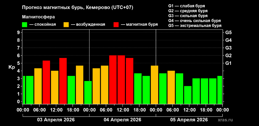 Специалисты института предупреждают: сегодня с 13:00 до 16:00 прогнозируется магнитная буря средней силы уровня G2.0. Завтра, с 07:00 до 16:00, интенсивность сохранится на том же уровне. К вечеру следующих суток буря начнет спадать, и магнитосфера будет лишь слегка возбуждена.