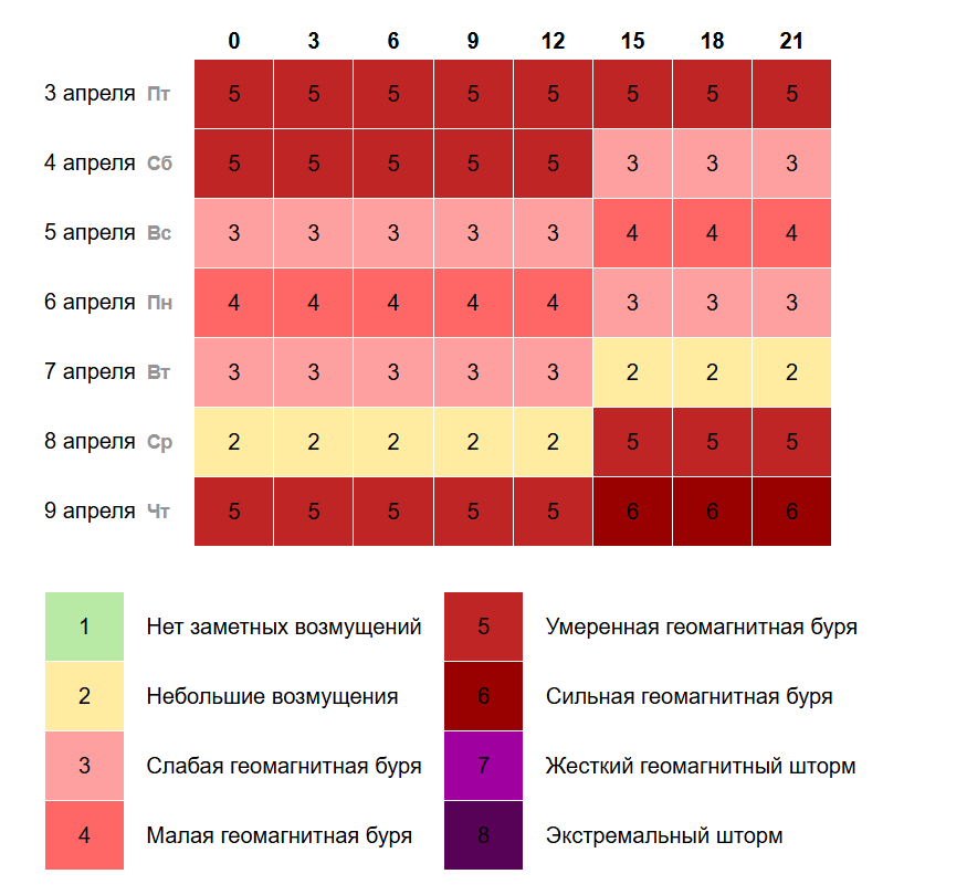 Полный календарь магнитных бурь на апрель доступен для ознакомления.