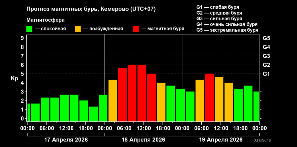 Специалисты института предупреждают, что уже завтра, 17 апреля, возможен всплеск до уровня G2.0, который считается средним по силе. Этот период продлится с раннего утра до 17:00. В воскресенье, 18 апреля, с 7:00 до 9:00 ожидается слабая магнитная буря, которая начнет стихать к вечеру, хотя магнитосфера останется возбужденной до конца дня.