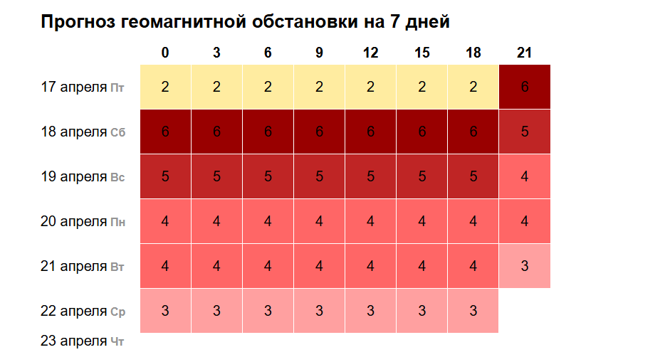 По данным лаборатории солнечной астрономии, солнечная активность достигнет пика вечером 17 апреля и продолжится весь день 18 апреля. К 19 апреля возмущения ослабнут до умеренного уровня, а затем до среды следующей недели сохранится состояние малой бури, согласно таблице прогнозов.