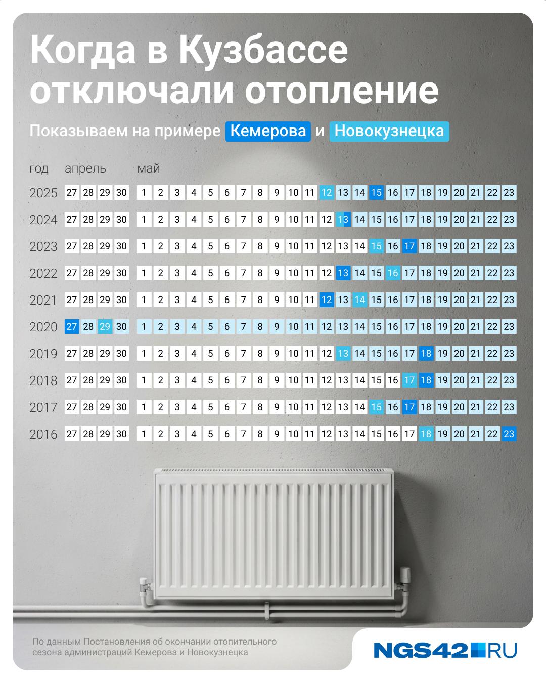 - Самый продолжительный сезон пришёлся на 2016 год: в Новокузнецке отопление отключили 18 мая, а в Кемерове — 23 мая.