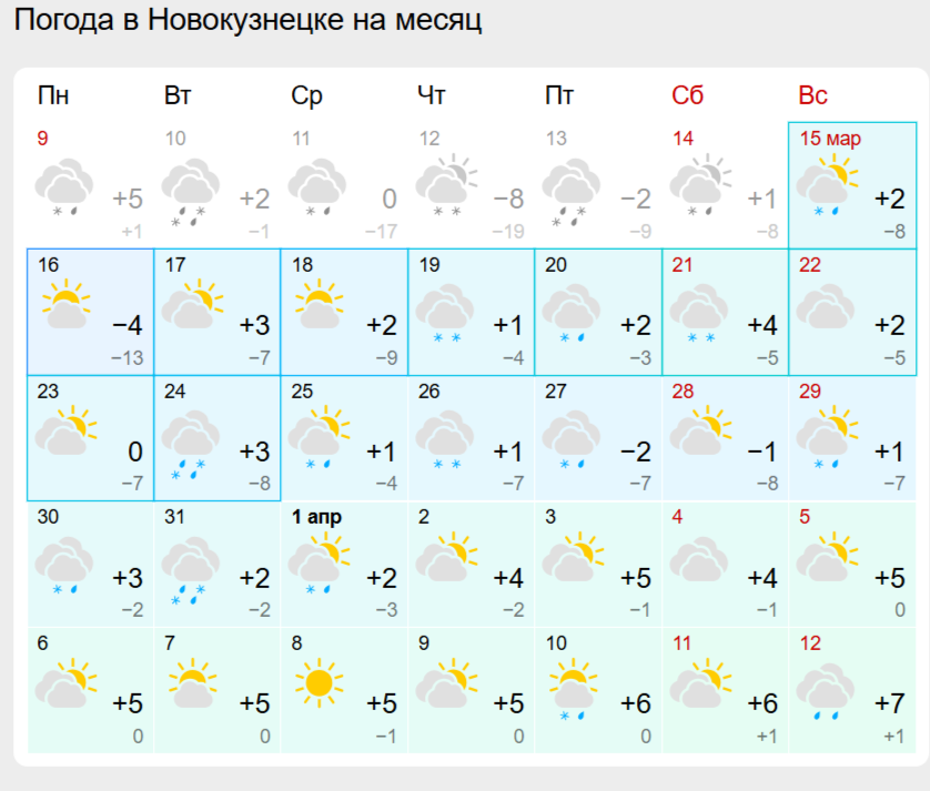 Согласно данным Gismeteo, в Кемерове на последние 15 дней марта не стоит ожидать потепления выше +5 градусов. Ясной и сухой погоды также не предвидится.