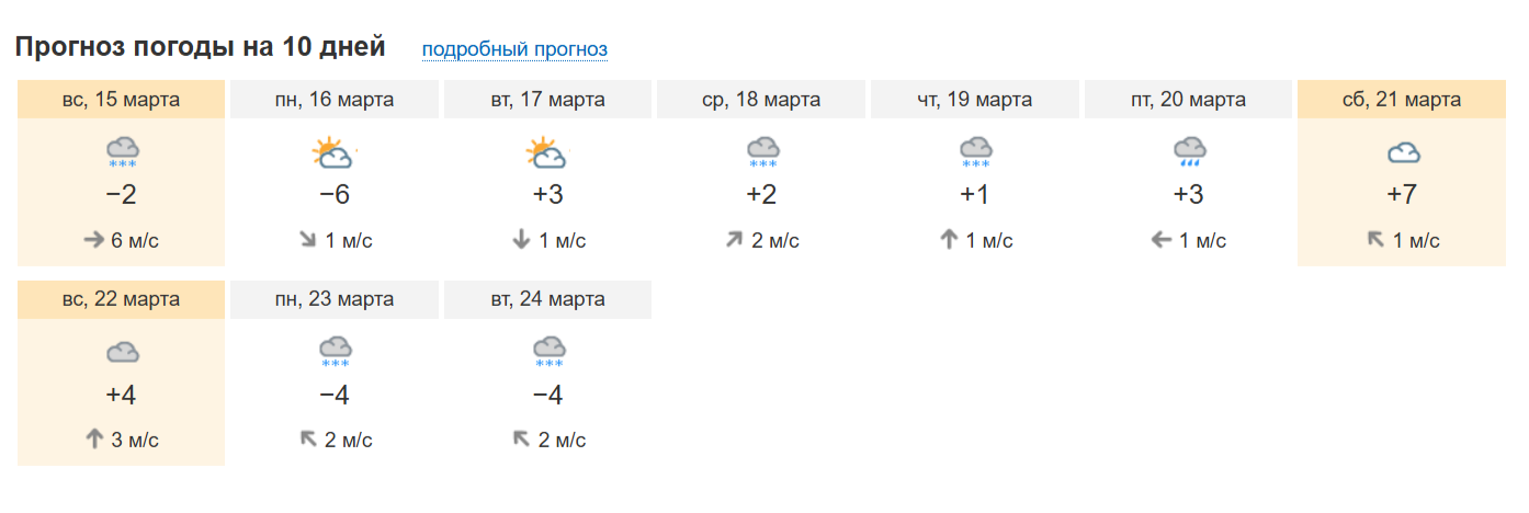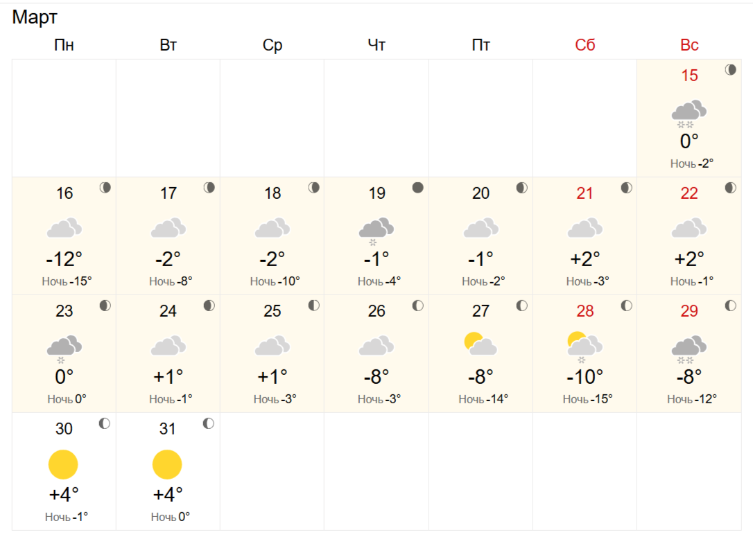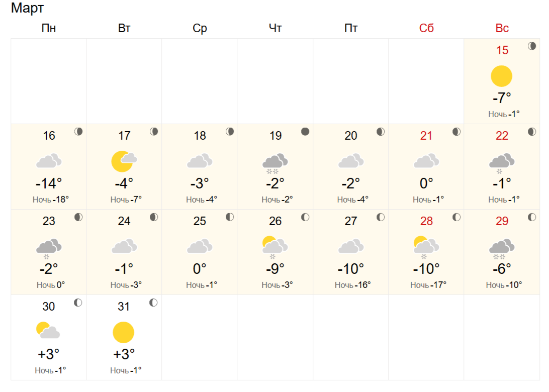 Неделя с 16 по 22 марта будет относительно теплой с температурами от 0 до +1 градуса. Исключением станет 16 число: ночью прогнозируется -18, днем -8 градусов. Осадки в виде снега и мокрого снега ожидаются почти каждый день, кроме 18 марта. Особенно сильные снегопады возможны 23 и 26 марта.