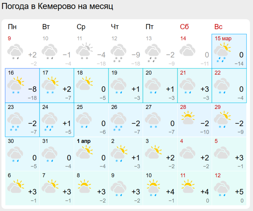 Прогноз сервиса World-weather мало отличается от предыдущего. Вторая половина марта не принесет в Кемеров потепления и солнечных дней. Температура будет держаться около нуля.