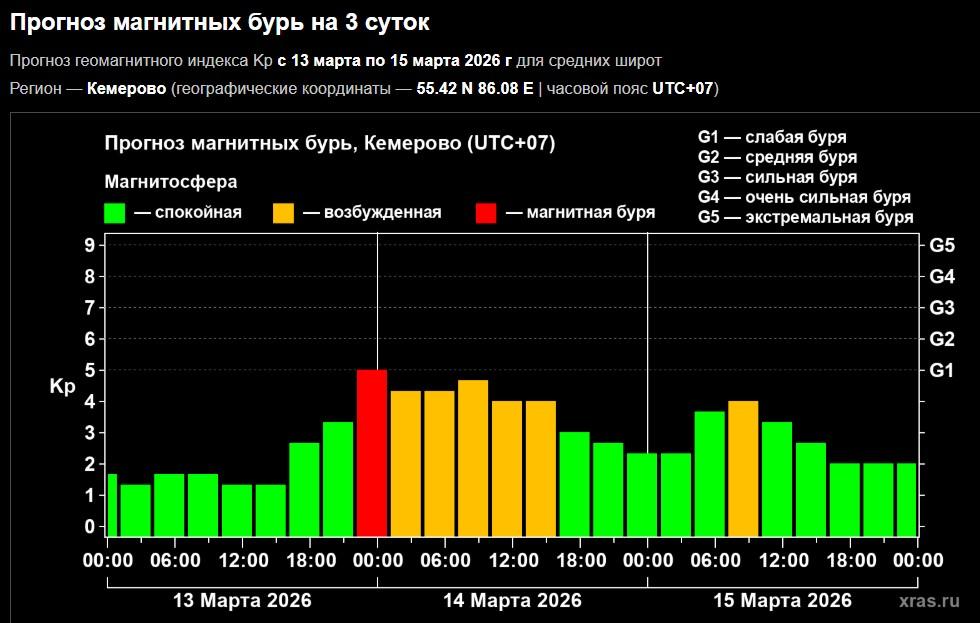 Явление классифицируется как слабое, уровень G1.0. Резкое увеличение активности в электромагнитном поле планеты прогнозируется после 18:00. Основная фаза бури стихнет к утру 14 марта, однако магнитосфера сохранит возбужденное состояние в течение всего этого дня.