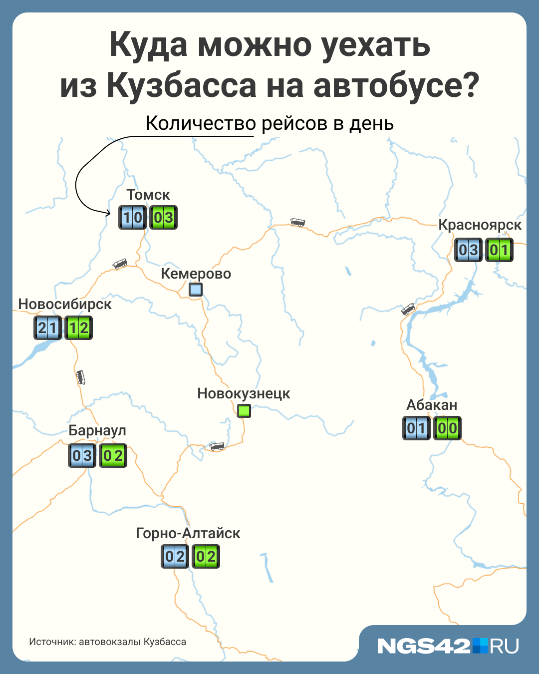 Прямые автобусные рейсы из Кемерова и Новокузнецка связывают Кузбасс с шестью соседними регионами.