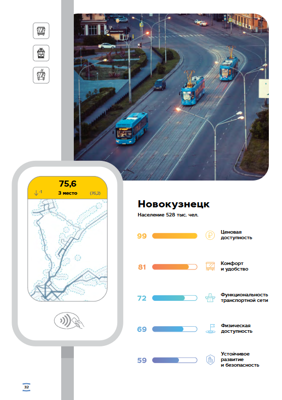 Эксперты оценивали транспортные системы сотен городов по более чем 65 параметрам. Критериями стали физическая и ценовая доступность, функциональность маршрутной сети, комфорт и безопасность поездок. По итогам года Новокузнецк набрал 75,6 балла из 100 возможных, что позволило ему войти в первую пятерку лидеров.