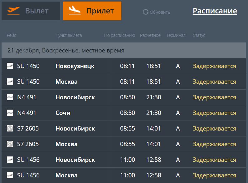 По сведениям с официального сайта авиагавани, 11 воздушных судов задерживаются из-за сложных метеоусловий. Авиакомпании «Сибирь», «Северный Ветер» и «Аэрофлот» уже объявили о переносе вылетов из Москвы, Сочи, Новосибирска и Новокузнецка.