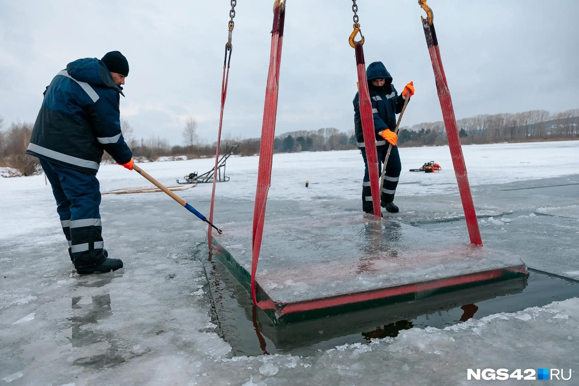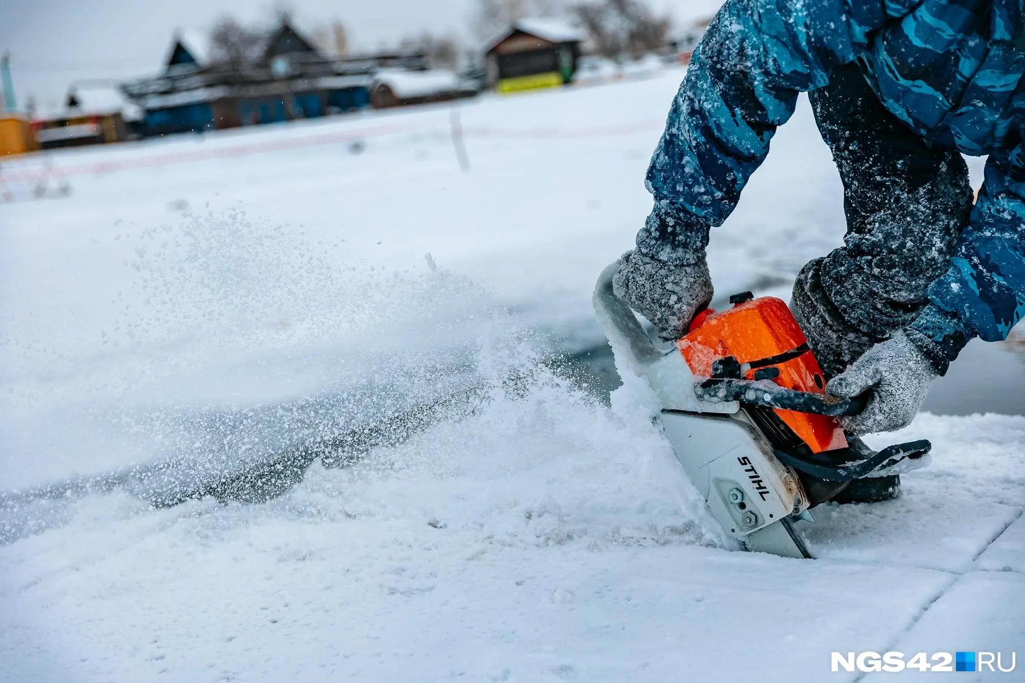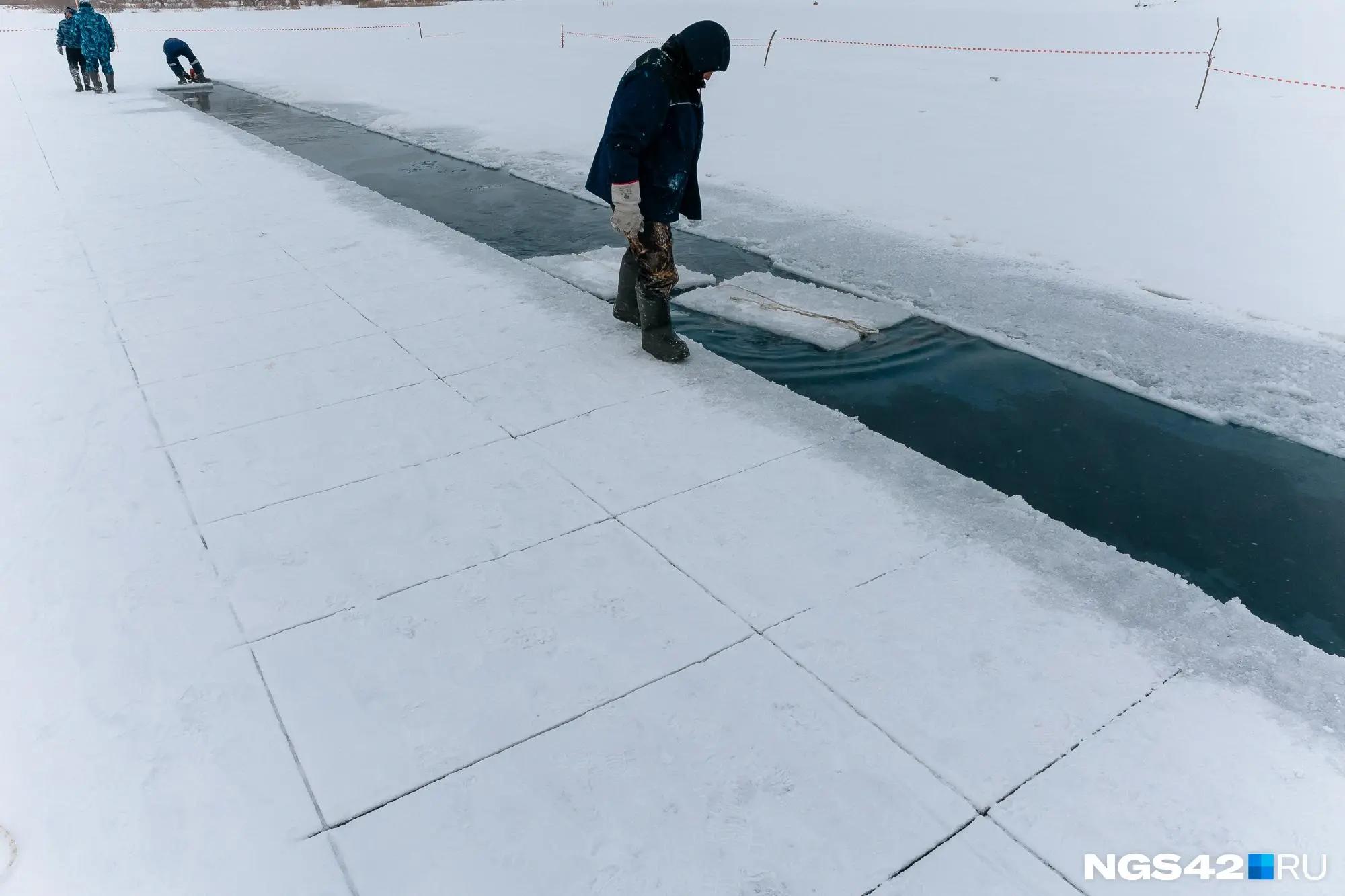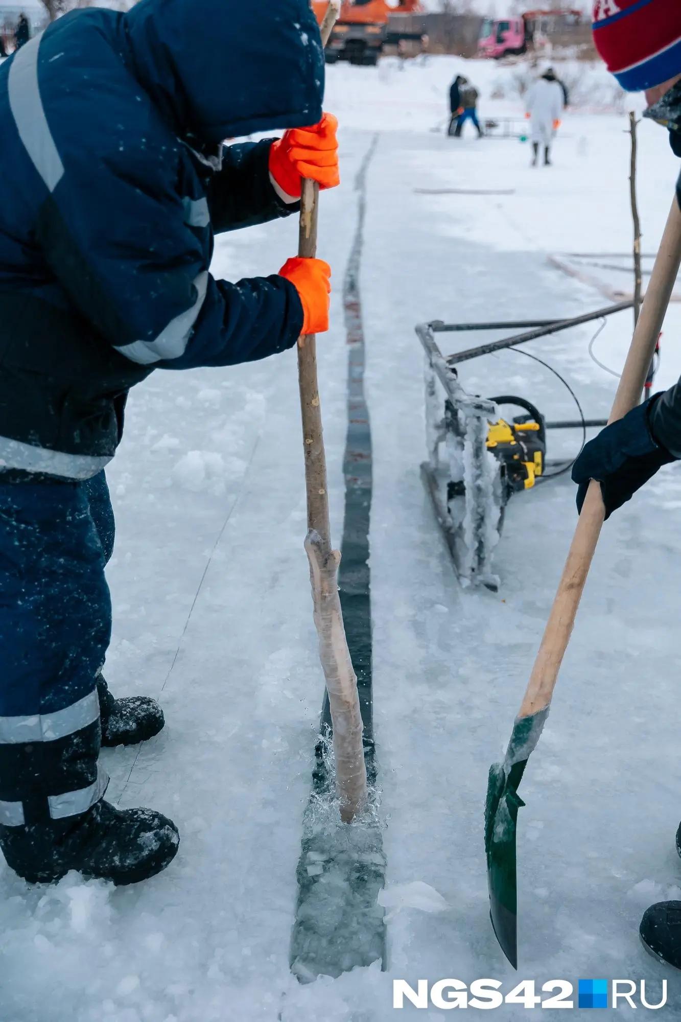 Оставшуюся толщину льда пробивают вручную. Затем блоки распиливают бензопилами согласно необходимым размерам.