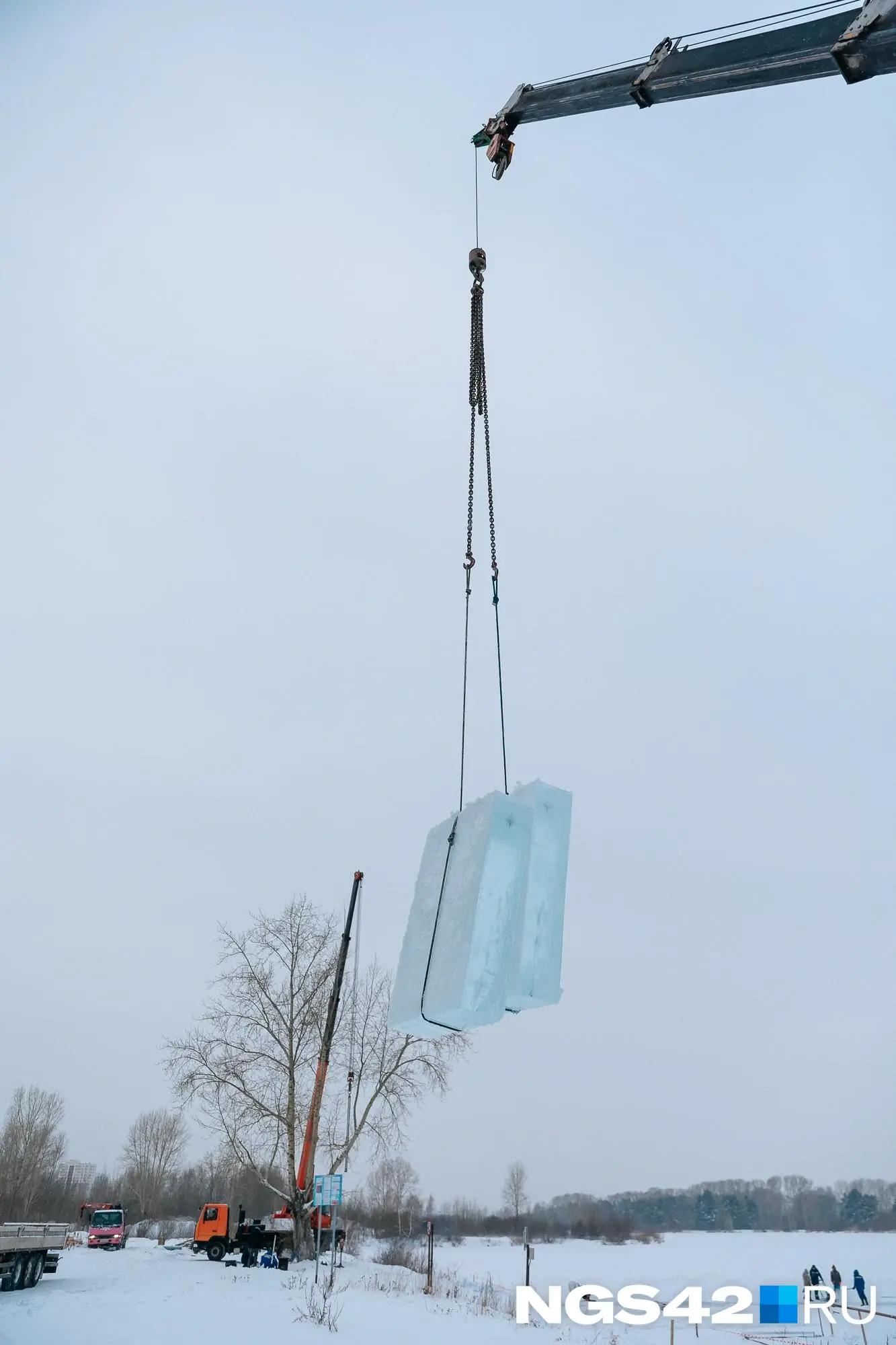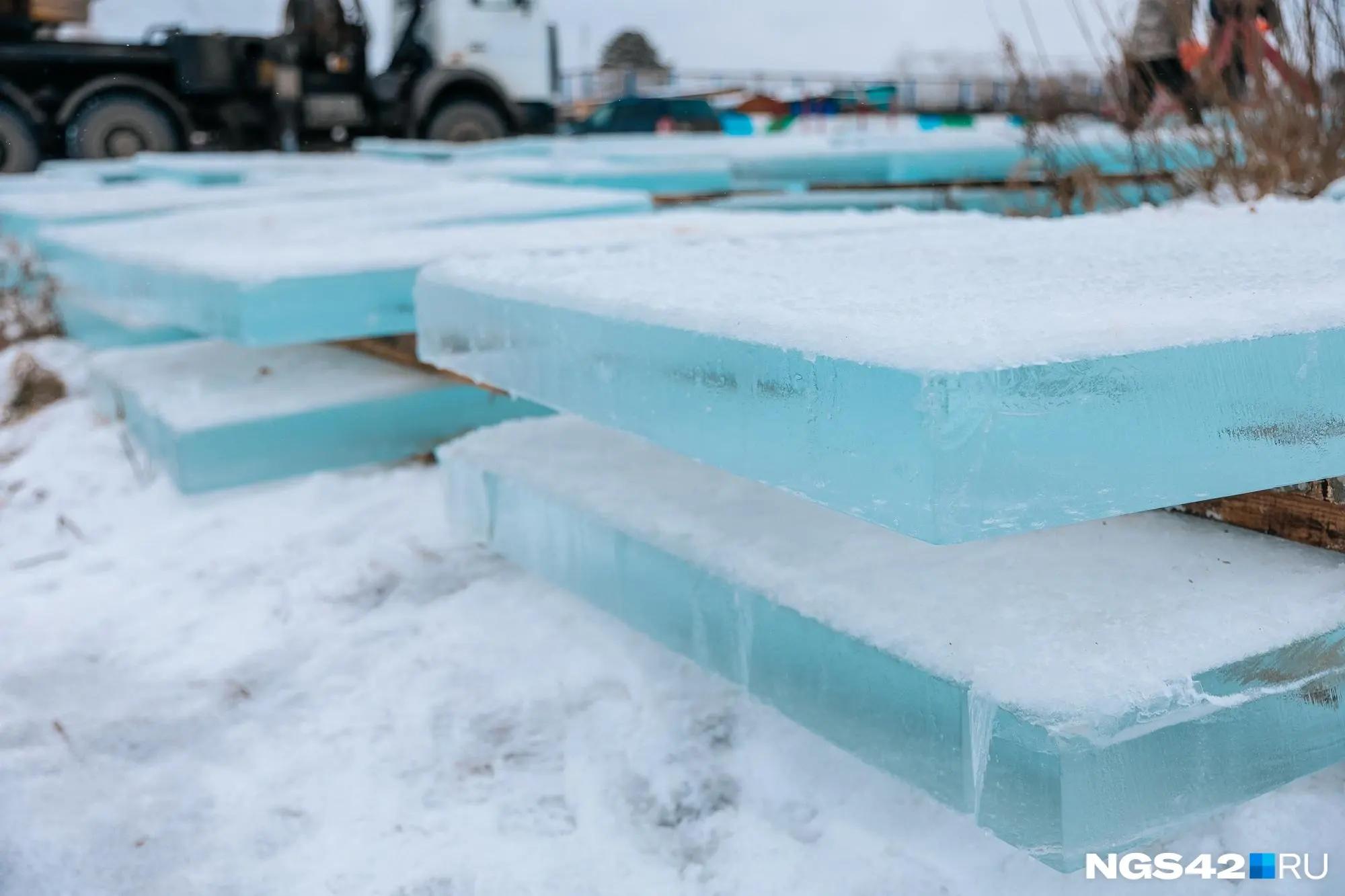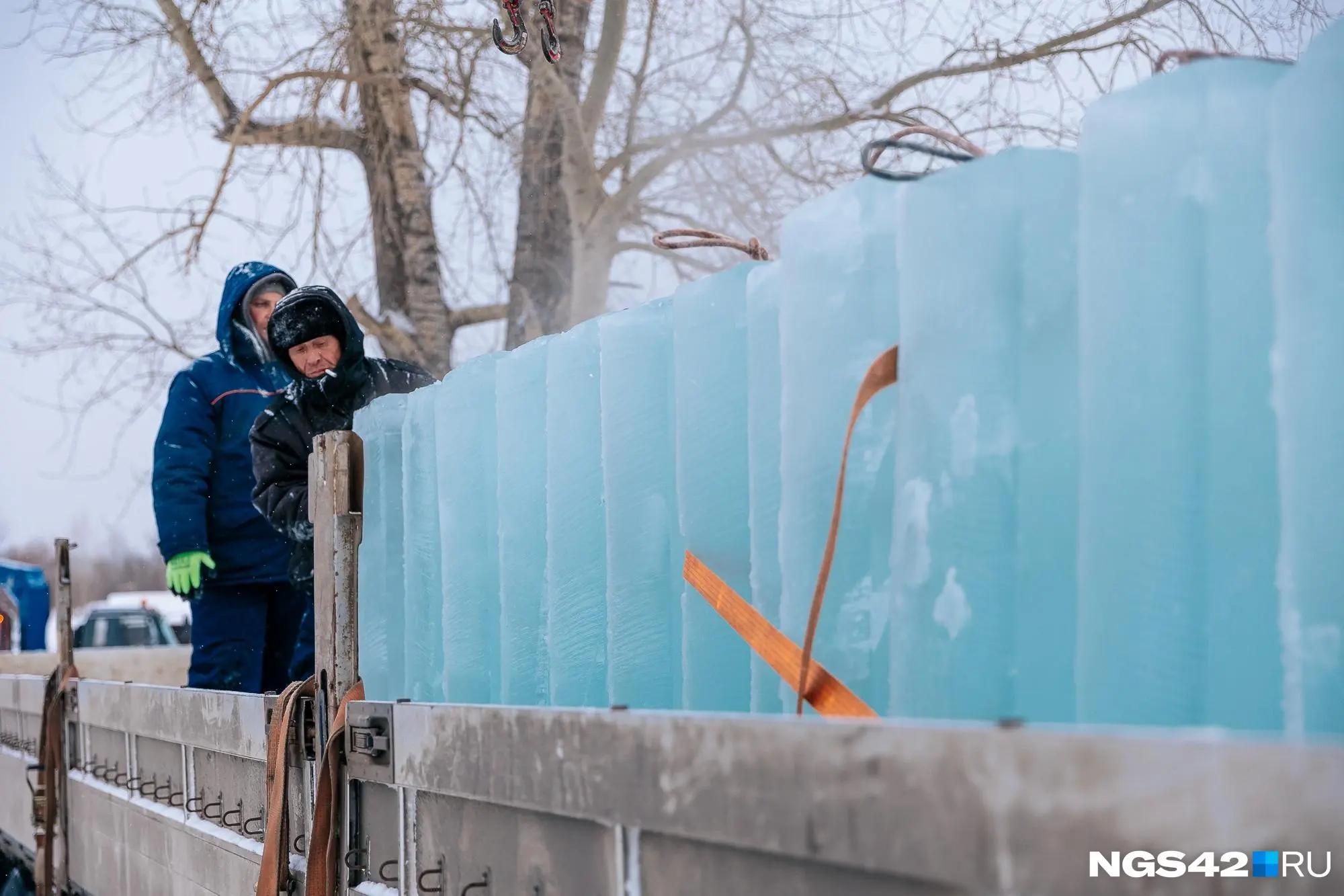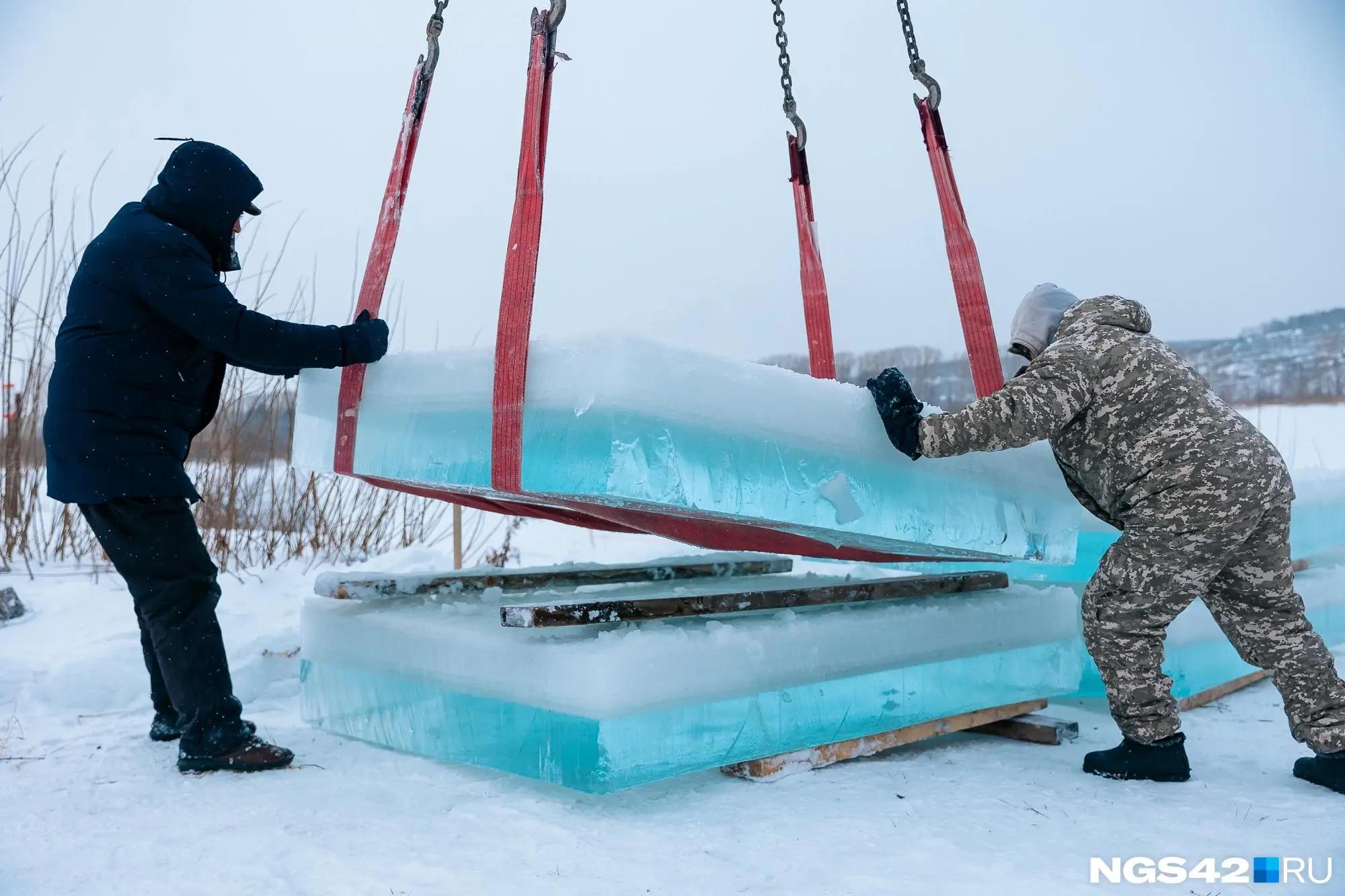 Монтаж снежного городка на площади Советов в Кемерове начался в воскресенье, 7 декабря. Ледяные глыбы, служащие материалом для хрупких скульптур, добывают на Красном озере.