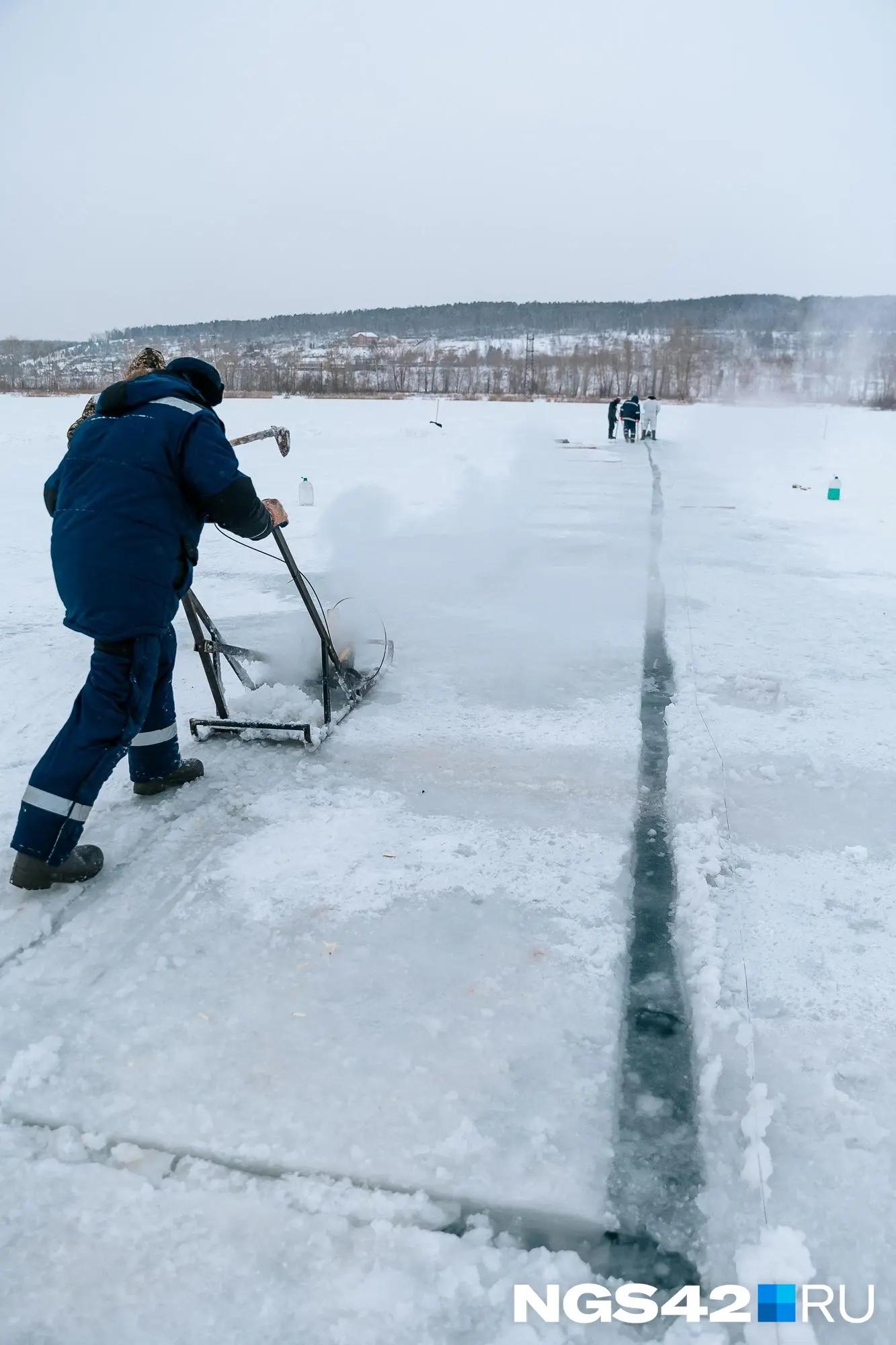 Первым делом выбирают участок озера с наиболее толстым и прочным ледяным покровом. Специальным инструментом на поверхности делают надрезы, обозначая контуры будущих плит.