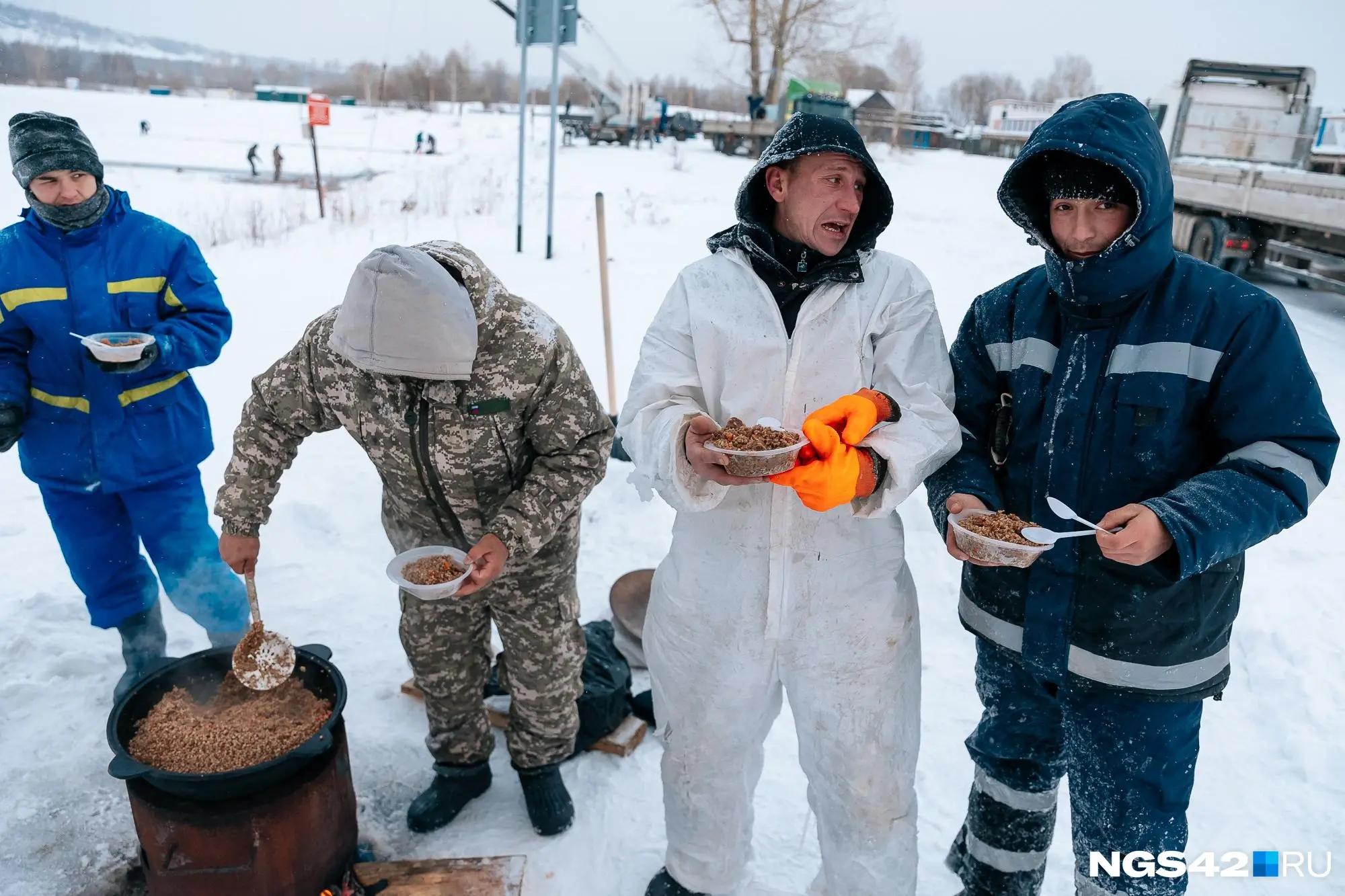 Бригады обедают прямо на месте, где организована полевая кухня. Чтобы согреться, рабочие пьют горячий чай и едят гречневую кашу.