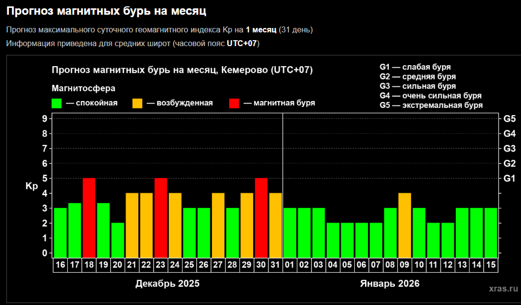 Небольшая магнитная активность, по прогнозам лаборатории, сохранится на протяжении всей следующей недели. Последняя в 2025 году магнитная буря накроет регион в канун Нового года — 30 декабря.