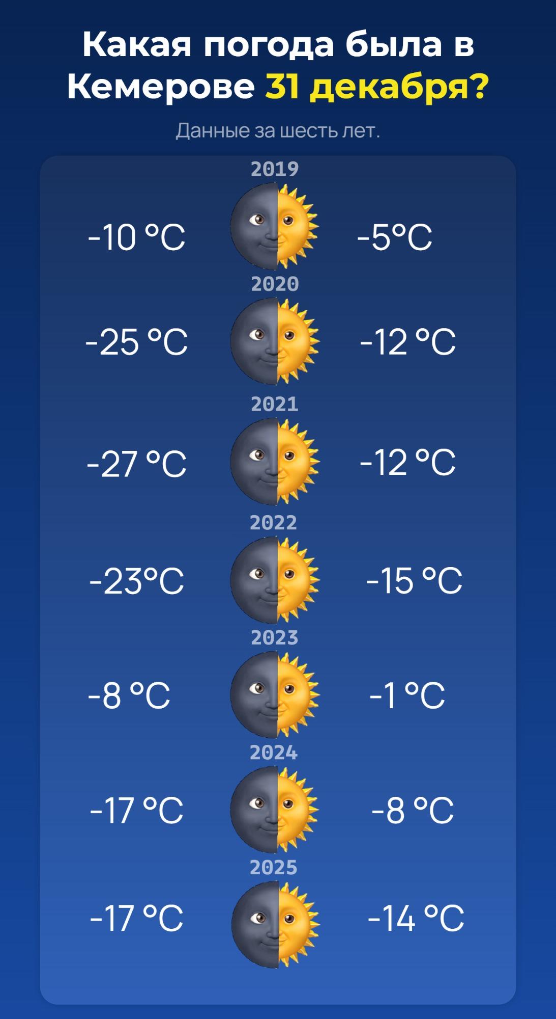 До наступления Нового года остаются считанные дни, и многие жители Кемерова планируют встретить его на улице. Чтобы помочь с выбором одежды, мы изучили погодные условия за шесть последних лет и на основе данных нескольких метеосервисов составили предположение о температуре в ночь с 31 декабря на 1 января.