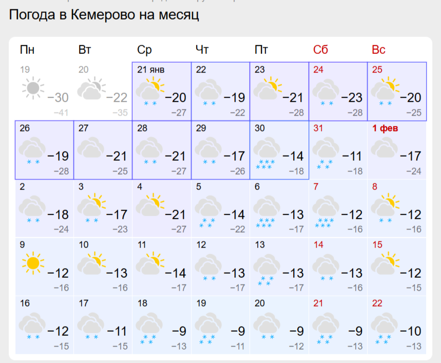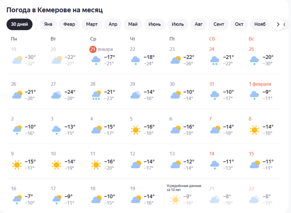 Погода в Кузбассе: прогноз на остаток января