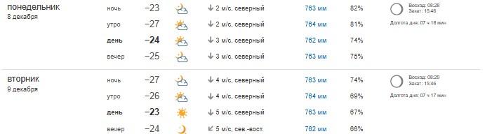 Самые сильные морозы прогнозируются в Мариинске. 8 декабря в семь утра температура достигнет -31 градуса. Осадков не будет, но погода будет облачной. Днем потеплеет до -27 градусов, а утром вторника похолодает до -33 градусов при ясном и солнечном небе.
